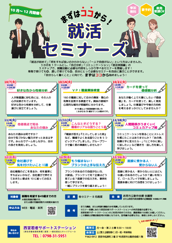 ※西宮若者サポートステーションへご登録がない場合は、利用登録が必要です。当日12:45にセミナー会場までお越しください。